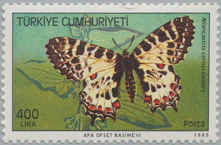 Visibility: public Image owner: none postage 10/28/1988 400l multi dt=butterflies (1988 Turkey) d=Allancastria cerisyi (1988) unwmk Crops No visible images cropped from this one. Measurements Resolution is unknown. Source Source name: Colnect File URL: http://i.colnect.net/b/2673/532/Eastern-Festoon-Allancastria-cerisyi.jpg Uploaded June 15, 2017, 6:25 pm by Stan Shebs |