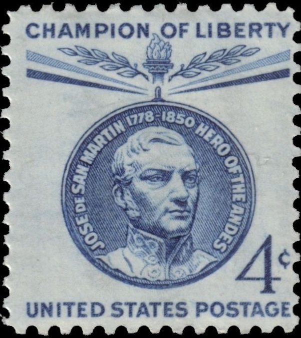 Visibility: public Image owner: none postage 2/25/1959 4c bl dt=Champion of Liberty d=San Martin medallion unwmk Crops No visible images cropped from this one. Measurements Resolution is unknown. Source Source name: Colnect File URL: http://i.colnect.net/b/4099/296/Jos-eacute--de-San-Mart-iacute-n-1778-1850-Argentine-political-leader.jpg Uploaded June 17, 2017, 6:00 pm by Stan Shebs |