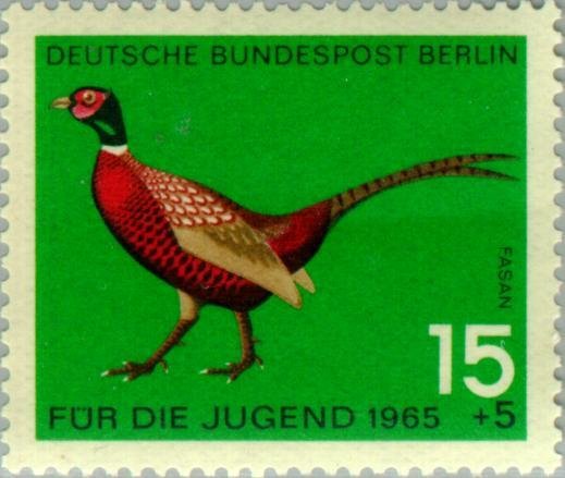 Visibility: public Image owner: none semipostal 4/1/1965 15+5pf multi issue=youth 1965 dt=birds (1965 Germany) d=Phasianus colchicus (1965) unwmk Crops No visible images cropped from this one. Measurements Resolution is unknown. Source Source name: Colnect File URL: http://i.colnect.net/b/154/998/Common-Pheasant-nbsp-Phasianus-colchicus.jpg Uploaded December 3, 2012, 11:22 pm by Stan Shebs |
