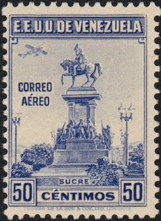 Visibility: public Image owner: none airmail 12/23/1938 50c ultra issue=Independence air unwmk perf=13.5 Crops No visible images cropped from this one. Measurements Resolution is unknown. Source Source name: Colnect File URL: http://i.colnect.net/b/2858/012/Antonio-José-de-Sucre-y-de-Alcalá-Monument.jpg Uploaded June 21, 2017, 11:42 am by Stan Shebs |
