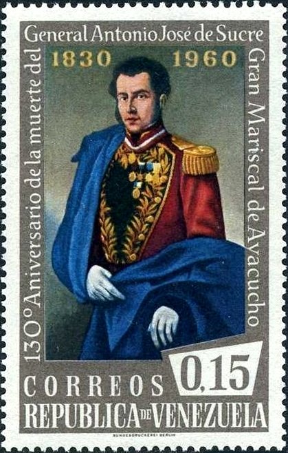 Visibility: public Image owner: none postage 11/13/1960 15c issue=Sucre death 130th d=Antonio José de Sucre (1960) unwmk Crops No visible images cropped from this one. Measurements Resolution is unknown. Source Source name: Colnect File URL: http://i.colnect.net/b/4031/591/Antonio-José-de-Sucre-y-de-Alcalá-1795-1830-General.jpg Uploaded June 21, 2017, 12:03 pm by Stan Shebs |