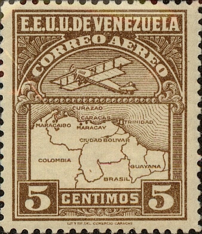 Visibility: public Image owner: none airmail 4/5/1930 5c brn issue=1930 air d=plane & map of Venezuela unwmk perf=12 Crops No visible images cropped from this one. Measurements Resolution is unknown. Source Source name: Colnect File URL: http://i.colnect.net/b/2803/255/Map-of-Venezuela-First-Series.jpg Uploaded June 21, 2017, 2:29 pm by Stan Shebs |