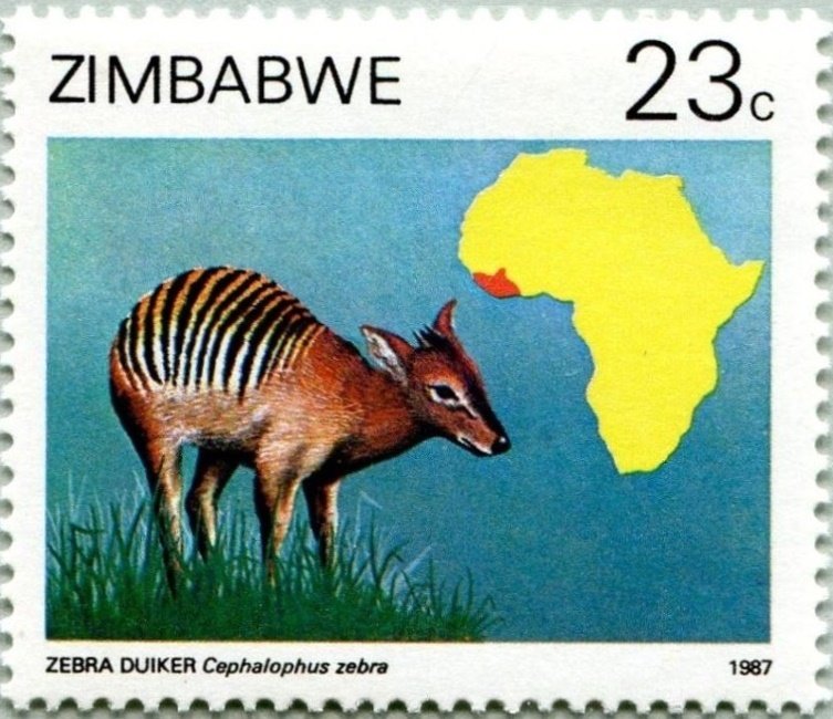 Visibility: public Image owner: none postage 10/7/1987 23c multi dt=duikers Of Africa d=zebra duiker Cephalophus zebra unwmk Crops No visible images cropped from this one. Measurements Resolution is unknown. Source Source name: Colnect File URL: http://i.colnect.net/b/3265/621/Zebra-Duiker-Cephalophus-zebra-.jpg Uploaded June 22, 2017, 8:42 pm by Stan Shebs |