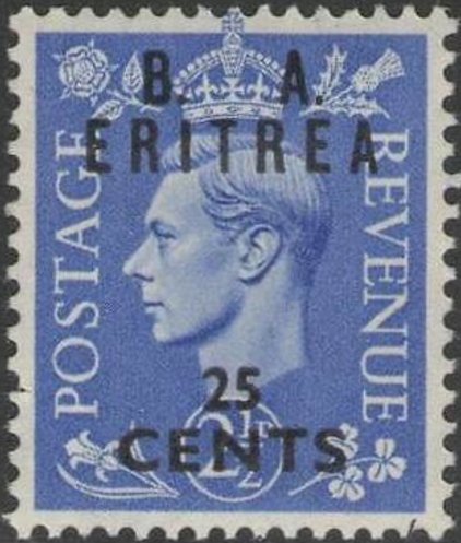 Visibility: public Image owner: none postage 2/6/1950 25c ultra issue=1950 d=King George VI (1937 a) ovpt=B. A.//ERITREA//value oc=blk on=issuer=Great Britain-2 1/2d-ultra-King George VI wmk=crown & GVIR perf=15x14 Crops No visible images cropped from this one. Measurements Resolution is unknown. Source Source name: Colnect File URL: http://i.colnect.net/b/3276/295/British-Stamp-Overprinted--BA-Eritrea-.jpg Uploaded June 22, 2017, 10:08 pm by Stan Shebs |