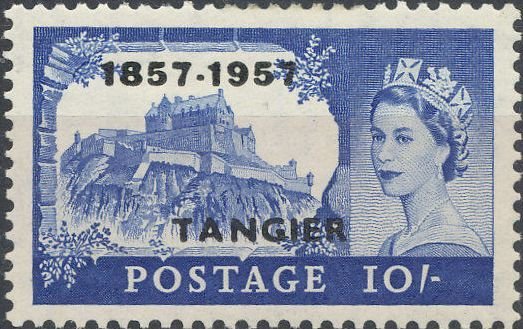 Visibility: public Image owner: none postage 4/1/1957 10sh ultra issue=PO 100th d=Edinburgh Castle & Queen Elizabeth II ovpt=1857-1957//TANGIER oc=blk on=issuer=Great Britain-1955-10sh wmk=St Edwards crown & E2R perf=11x11.75 Crops No visible images cropped from this one. Measurements Resolution is unknown. Source Source name: Colnect File URL: http://i.colnect.net/b/3481/302/Queen-Elisabeth-centenary-overprint.jpg Uploaded June 23, 2017, 2:10 pm by Stan Shebs |