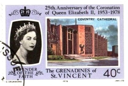 Visibility: public Image owner: none postage 6/2/1978 40c multi issue=Elizabeth II Coronation 25th d=Coventry Cathedral wmk=crown & CA spiral Crops No visible images cropped from this one. Measurements Resolution is unknown. Source Source name: Colnect File URL: http://i.colnect.net/b/3056/284/Coventry.jpg Uploaded June 26, 2017, 3:41 pm by Stan Shebs |