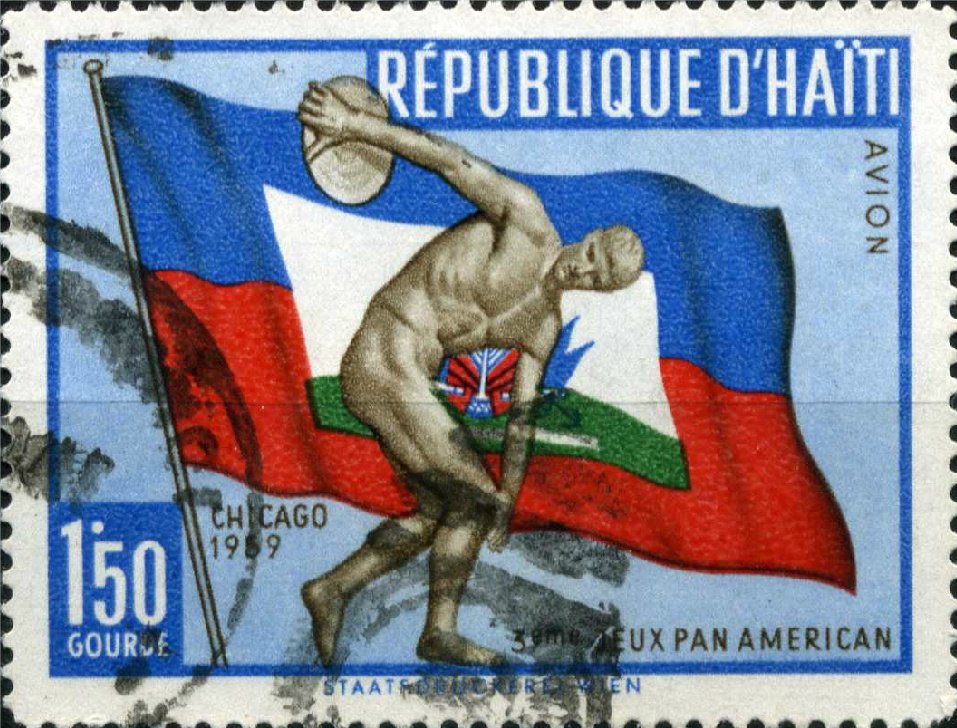 Visibility: public Image owner: none postage 8/27/1959 1.50g multi issue=3rd Pan-American Games d=flag of Haiti - discus thrower unwmk Crops No visible images cropped from this one. Measurements Resolution is unknown. Source Source name: Colnect File URL: http://i.colnect.net/b/3589/782/Flag-of-Haiti---Discus-thrower.jpg Uploaded June 27, 2017, 4:23 pm by Stan Shebs |