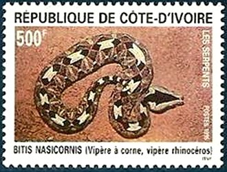 Visibility: public Image owner: none postage 6/23/1995 500fr multi issue=Snakes 1995 dt=snakes (1995 Ivory Coast) d=Bitis nasicornis (1995) unwmk Crops No visible images cropped from this one. Measurements Resolution is unknown. Source Source name: Colnect File URL: http://i.colnect.net/b/2939/078/Rhinoceros-Viper-Bitis-nasicornis.jpg Uploaded June 27, 2017, 9:47 pm by Stan Shebs |