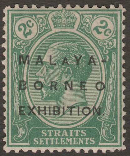 Visibility: public Image owner: none postage 2c grn issue=Malaya-Borneo Exhibition b d=King George V & kris swords ovpt=MALAYA-//BORNEO//EXHIBITION oc=blk on=1919-2c-grn wmk=mult crown & script CA perf=14 Crops No visible images cropped from this one. Measurements Resolution is unknown. Source Source name: Colnect File URL: http://i.colnect.net/b/3260/854/Overprint-on-Issues-of-1921-1933.jpg Uploaded July 1, 2017, 1:21 am by Stan Shebs |