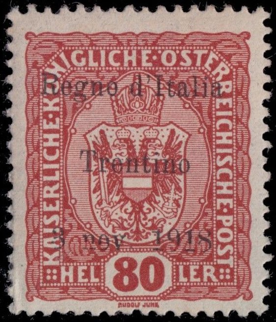 Visibility: public Image owner: none postage 80h orgbrn issue=1918d d=arms of Austria (1916 a) ovpt=Regno d Italia//Trentino//3 nov 1918 oc=blk on=issuer=Austria-1916-80h unwmk perf=12.5 Crops No visible images cropped from this one. Measurements Resolution is unknown. Source Source name: Colnect File URL: http://i.colnect.net/b/3905/835/Italian-Occupation-of-Trentin.jpg Uploaded July 5, 2017, 5:15 pm by Stan Shebs |