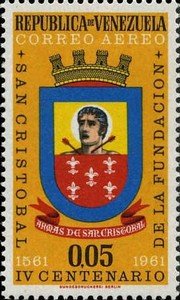Visibility: public Image owner: none airmail 4/10/1961 0.05b multi issue=400th Anniversary of San Cristobal d=arms of San Cristobal unwmk perf=14 Crops No visible images cropped from this one. Measurements Resolution is unknown. Source Source name: Colnect File URL: http://i.colnect.net/b/503/010/Arms-of-San-Cristobal.jpg Uploaded August 25, 2014, 8:37 pm by Stan Shebs |