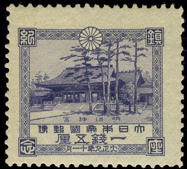 Visibility: public Image owner: none postage 11/1/1920 1 1/2s dlvio d=Meiji Shrine wmk=zigzag lines perf=12.5 Crops No visible images cropped from this one. Measurements Resolution is unknown. Source Source name: Colnect File URL: http://i.colnect.net/b/3879/505/Meiji-Shrine.jpg Uploaded July 21, 2017, 4:59 pm by Stan Shebs |
