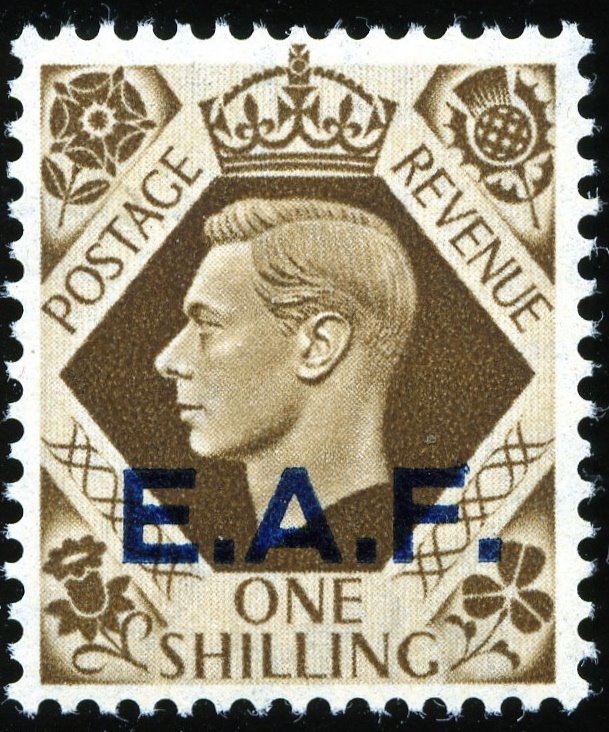 Visibility: public Image owner: none postage 1/15/1943 1sh brn issue=1943 d=King George VI (1939 a) ovpt=E.A.F. oc=blk on=issuer=Great Britain-1sh-brn-King George VI wmk=crown & GVIR perf=15x14 Crops No visible images cropped from this one. Measurements Resolution is unknown. Source Source name: Colnect File URL: http://i.colnect.net/b/3964/260/British-Stamp-Overprinted--quot-EAF-quot-.jpg Uploaded July 22, 2017, 3:02 pm by Stan Shebs |