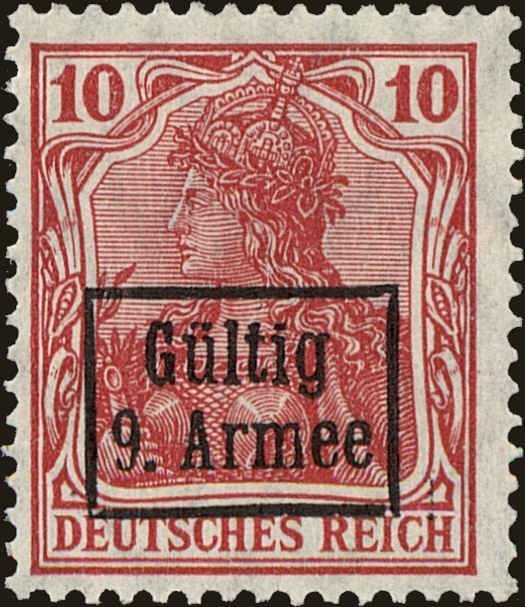 Visibility: public Image owner: none postage 10pf car issue=1918 d=Germania (Deutsches Reich) ovpt=Gultig//9. Armee(box) oc=blk on=issuer=Germany-1905-10pf-car wmk=lozenges Crops No visible images cropped from this one. Measurements Resolution is unknown. Source Source name: Colnect File URL: http://i.colnect.net/b/4178/574/overprint-on--quot-Germania-quot-.jpg Page URL: https://colnect.com/en/stamps/stamp/321080-overprint_on_Germania-Deutsche_Post_Rumania-9_armee-Germany_Colonies_and_Post_Abroad Uploaded July 23, 2017, 2:01 am by Stan Shebs |