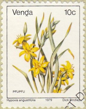Visibility: public Image owner: none postage 9/13/1979 10c issue=independence b dt=flowers (1979 Venda) d=Hypoxis angustifolia unwmk Crops No visible images cropped from this one. Measurements Resolution is unknown. Source Source name: Colnect File URL: http://i.colnect.net/b/3017/564/Hypoxis-angustifolia.jpg Uploaded July 23, 2017, 8:15 pm by Stan Shebs |