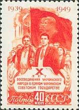 Visibility: public Image owner: none postage 12/23/1949 40k redorg issue=western territory return 10th d=Ukrainian workers with banner unwmk perf=12 Crops No visible images cropped from this one. Measurements Resolution is unknown. Source Source name: Colnect File URL: http://i.colnect.net/b/192/988/Reunion-of-West-Ukraine-with-Ukrainian-SSR.jpg Uploaded August 25, 2014, 9:53 pm by Stan Shebs |