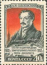 Visibility: public Image owner: none postage 12/8/1952 40k multi issue=Odoyevsky 150th unwmk perf=12 Crops No visible images cropped from this one. Measurements Resolution is unknown. Source Source name: Colnect File URL: http://i.colnect.net/b/193/074/Alexander-Odoevsky-1802-1839-Russian-poet-and-decembrist.jpg Uploaded August 25, 2014, 9:53 pm by Stan Shebs |