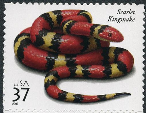 Visibility: public Image owner: none postage 10/7/2003 37 multi dt=reptiles & amphibians (2003) d=scarlet kingsnake unwmk Crops No visible images cropped from this one. Measurements Resolution is unknown. Source Source name: Colnect File URL: http://i.colnect.net/b/202/169/Scarlet-Kingsnake-Lampropeltis-elapsoides.jpg Uploaded August 25, 2014, 11:22 pm by Stan Shebs |