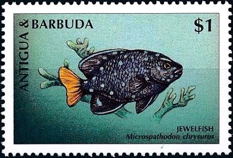 Visibility: public Image owner: none postage 2/19/1998 $1 multi dt=fishes (1998 Antigua) d=Microspathodon chrysurus (1998) unwmk perf=14.25 Crops No visible images cropped from this one. Measurements Resolution is unknown. Source Source name: Colnect File URL: http://i.colnect.net/b/4105/273/Jewelfish.jpg Uploaded October 8, 2017, 6:02 pm by Stan Shebs |
