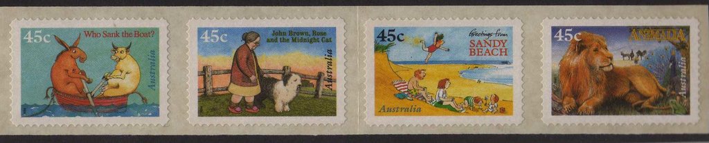 Visibility: public Image owner: none Crops No visible images cropped from this one. Measurements Resolution is unknown. Source Source name: Colnect File URL: http://i.colnect.net/b/4104/736/Children--s-Book-Council-self-adhesive-strip-of-4.jpg Uploaded October 9, 2017, 8:39 pm by Stan Shebs |