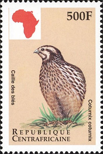 Visibility: public Image owner: none postage 3/10/1999 500fr multi issue=African Birds 1999 dt=African Birds (1999) d=Coturnix coturnix (1999) unwmk Crops No visible images cropped from this one. Measurements Resolution is unknown. Source Source name: Colnect File URL: http://i.colnect.net/b/4383/426/Common-Quail-Coturnix-coturnix.jpg Uploaded October 24, 2017, 4:55 pm by Stan Shebs |