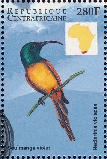 Visibility: public Image owner: none postage 3/10/1999 280fr multi issue=African Birds 1999 dt=African Birds (1999) d=Nectarinia violacea unwmk Crops No visible images cropped from this one. Measurements Resolution is unknown. Source Source name: Colnect File URL: http://i.colnect.net/b/4383/435/Orange-breasted-Sunbird-Anthobaphes-violacea.jpg Uploaded October 24, 2017, 4:56 pm by Stan Shebs |