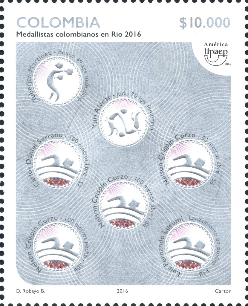 Visibility: public Image owner: none postage 12/12/2016 10000p multi issue=America 2016 unwmk Crops No visible images cropped from this one. Measurements Resolution is unknown. Source Source name: Colnect File URL: http://i.colnect.net/b/4072/252/Colombian-Medalists-in-Rio-2016.jpg Uploaded October 26, 2017, 6:34 pm by Stan Shebs |