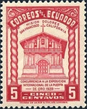 Visibility: public Image owner: none postage 6/16/1939 5c rosered issue=Golden Gate Expo d=Dolores Mission, San Francisco unwmk perf=12 Crops No visible images cropped from this one. Measurements Resolution is unknown. Source Source name: Colnect File URL: http://i.colnect.net/b/3999/162/Dolores-Mission-San-Francisco.jpg Uploaded November 6, 2017, 4:45 pm by Stan Shebs |