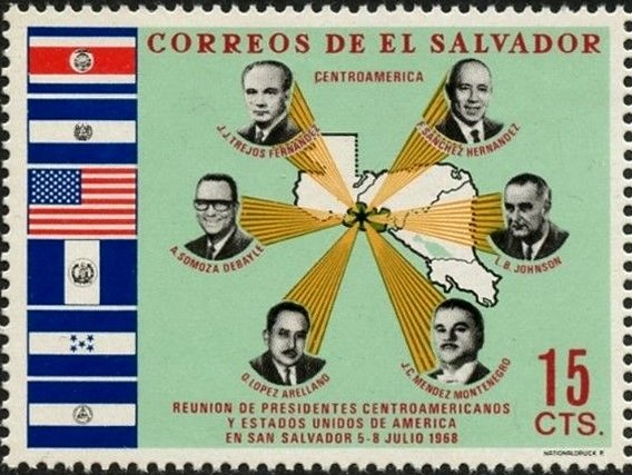 Visibility: public Image owner: none postage 1/20/1969 15c multi issue=Meeting of U.S. President Lyndon B. Johnson , with Central American Presidents, San Salvador unwmk Crops No visible images cropped from this one. Measurements Resolution is unknown. Source Source name: Colnect File URL: http://i.colnect.net/b/4110/528/Presidents-and-Flags.jpg Uploaded November 6, 2017, 8:58 pm by Stan Shebs |