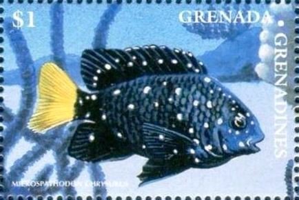 Visibility: public Image owner: none postage 12/12/1997 $1 multi issue=Fish 1997 dt=fishes (1997 Grenada Grenadines) d=Microspathodon chrysurus (1997) unwmk perf=14.25 Crops No visible images cropped from this one. Measurements Resolution is unknown. Source Source name: Colnect File URL: http://i.colnect.net/b/4385/464/Microspathodon-chrysurus.jpg Uploaded November 22, 2017, 6:27 pm by Stan Shebs |
