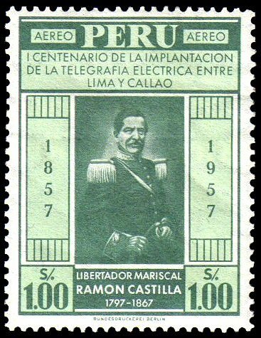 Visibility: public Image owner: none airmail 4/7/1958 1s grn<grn issue=Lima-Callao telegraph 100th d=Ramon Castilla wmk=crosses & circles Crops No visible images cropped from this one. Measurements Resolution is unknown. Source Source name: Colnect File URL: http://i.colnect.net/images/b/1103/551/Ramon-Castilla.jpg Uploaded August 26, 2014, 2:33 pm by Stan Shebs |