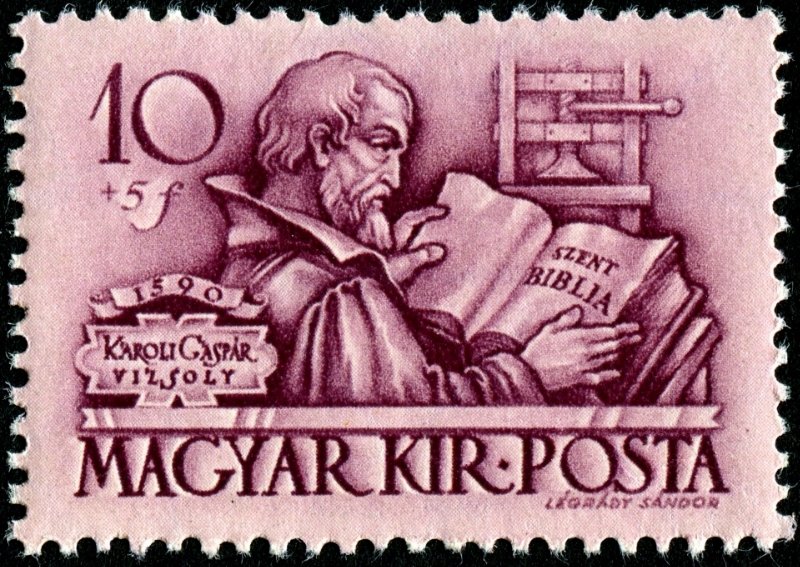 Visibility: public Image owner: none semipostal 10/1/1939 10+5f cl issue=National Protestant Day 1939 d=Gáspár Károl wmk=double cross on pyramid Crops No visible images cropped from this one. Measurements Resolution is unknown. Source Source name: Colnect File URL: http://i.colnect.net/b/3698/862/G-aacute-sp-aacute-r-K-aacute-roli-Bible-translator--amp--printing-press.jpg Uploaded November 27, 2017, 12:17 am by Stan Shebs |