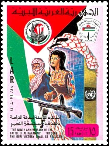 Visibility: public Image owner: none postage 3/31/1977 15dh multi issue=9th Anniversary of Battle of Al-Karamah unwmk Crops No visible images cropped from this one. Measurements Resolution is unknown. Source Source name: Colnect File URL: http://i.colnect.net/b/4096/382/Palestine-Israel-al-Fatah-Flags.jpg Uploaded December 5, 2017, 5:51 pm by Stan Shebs |