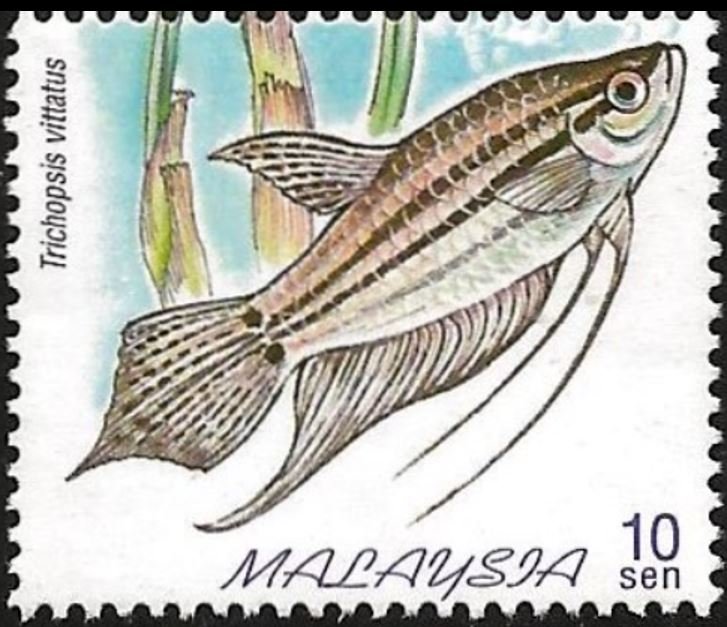 Visibility: public Image owner: none postage 7/31/1999 10sen multi dt=plants & freshwater fishes of Malaysia d=Trichopsis vittatus wmk=SPM multiple Crops No visible images cropped from this one. Measurements Resolution is unknown. Source Source name: Colnect File URL: http://i.colnect.net/b/4140/245/Croaking-Gourami-Trichopsis-vittata.jpg Uploaded December 7, 2017, 6:16 pm by Stan Shebs |