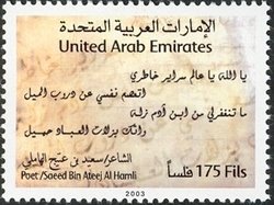 Visibility: public Image owner: none postage 12/29/2003 175f multi dt=Saeed Bin Ateej Al Hamli poetry unwmk Crops No visible images cropped from this one. Measurements Resolution is unknown. Source Source name: Colnect File URL: http://i.colnect.net/b/1390/103/Poet---Saeed-Bin-Ateej-Al-Hamli.jpg Uploaded August 26, 2014, 3:57 pm by Stan Shebs |