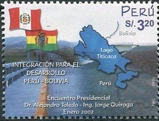 Visibility: public Image owner: none postage 11/29/2002 3.20s multi issue=Peru-Bolivia Integrated Development Plan unwmk Crops No visible images cropped from this one. Measurements Resolution is unknown. Source Source name: Colnect File URL: http://i.colnect.net/b/3557/598/Map-of-Titicaca-Lake-Flags-Bridge.jpg Uploaded December 27, 2017, 6:17 pm by Stan Shebs |