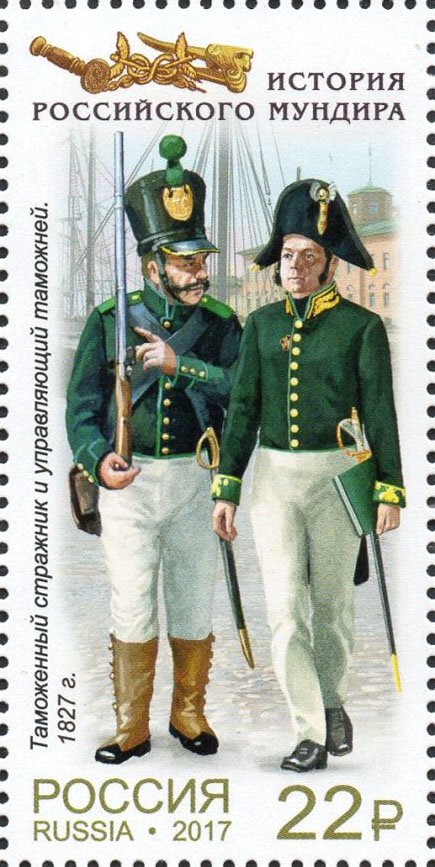 Visibility: public Image owner: none postage 10/25/2017 22r multi issue=History of the Russian uniform (continuation of the series) - Uniform jackets of the Russian customs d=Customs guard & customs manager 1827 unwmk Crops No visible images cropped from this one. Measurements Resolution is unknown. Source Source name: Colnect File URL: http://i.colnect.net/b/4468/715/Customs-guard-and-customs-manager-1827.jpg Uploaded December 31, 2017, 10:19 pm by Stan Shebs |