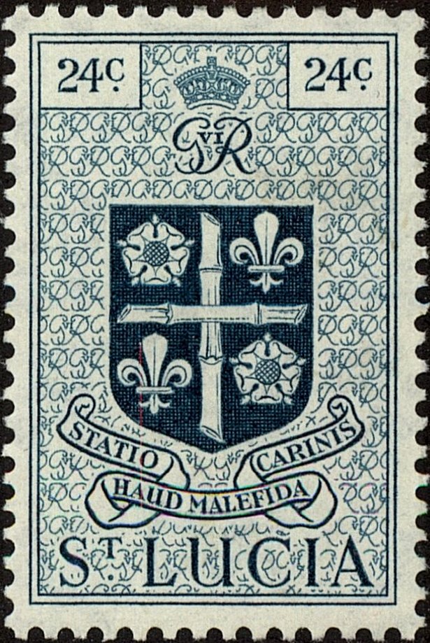Visibility: public Image owner: none postage 10/1/1949 24c prusbl issue=1949 d=arms of St. Lucia (1949) wmk=mult crown & script CA Crops No visible images cropped from this one. Measurements Resolution is unknown. Source Source name: Colnect File URL: http://i.colnect.net/b/4172/661/Coat-of-arms.jpg Uploaded January 1, 2018, 10:49 pm by Stan Shebs |