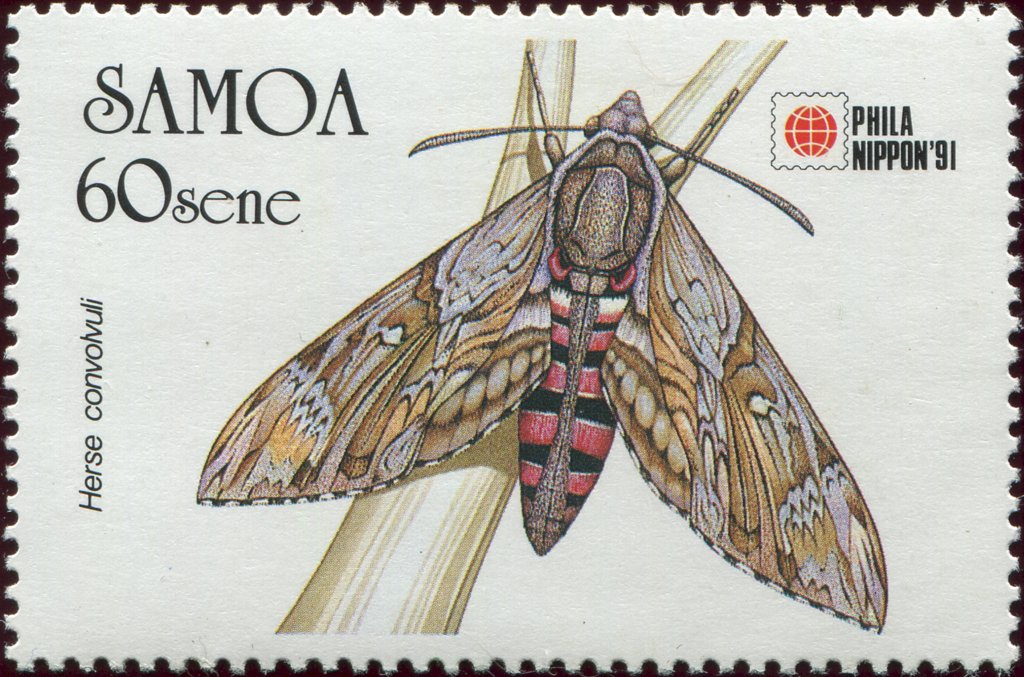 Visibility: public Image owner: none postage 11/16/1991 60s multi issue=PHILANIPPON '91 dt=hawk moths d=Herse convolvuli unwmk Crops No visible images cropped from this one. Measurements Resolution is unknown. Source Source name: Colnect File URL: http://i.colnect.net/b/4360/787/Herse-convolvuli.jpg Uploaded January 2, 2018, 5:02 pm by Stan Shebs |