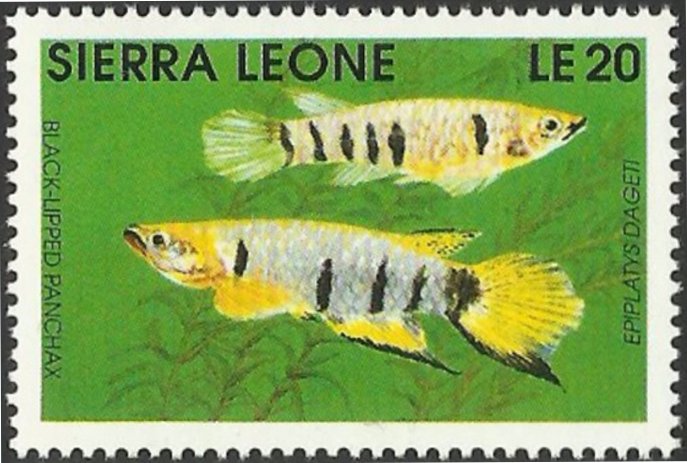 Visibility: public Image owner: none postage 6/3/1991 20le multi dt=fishes (1991 Sierra Leone) d=Epiplatys dageti unwmk perf=14 Crops No visible images cropped from this one. Measurements Resolution is unknown. Source Source name: Colnect File URL: http://i.colnect.net/b/4207/908/Black-lipped-Panchax-Epiplatys-dageti.jpg Uploaded January 3, 2018, 9:13 pm by Stan Shebs |