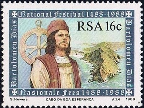 Visibility: public Image owner: none postage 2/3/1988 16c multi issue=500th Anniversary of Discovery of Cape of Good Hope d=Bartolomeu Dias and Cape of Good Hope wmk=RSA in triangle Crops No visible images cropped from this one. Measurements Resolution is unknown. Source Source name: Colnect File URL: http://i.colnect.net/b/4389/140/Bartholomee-Dias-1450-1500.jpg Uploaded January 5, 2018, 12:13 am by Stan Shebs |