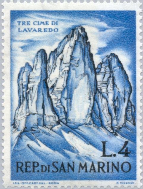 Visibility: public Image owner: none postage 6/14/1962 4l multi dt=alpinism d=Tre Cime di Lavaredo wmk=triskelion perf=14 Crops No visible images cropped from this one. Measurements Resolution is unknown. Source Source name: Colnect File URL: http://i.colnect.net/b/170/470/Three-Peaks-of-Javaredo.jpg Uploaded August 26, 2014, 4:37 pm by Stan Shebs |
