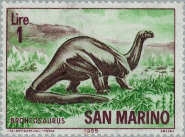 Visibility: public Image owner: none postage 6/30/1965 1l multi dt=dinosaurs (1965 San Marino) d=Brontosaurus (1965 San Marino) wmk=triskelion perf=14 Crops No visible images cropped from this one. Measurements Resolution is unknown. Source Source name: Colnect File URL: http://i.colnect.net/b/171/105/Brontosaurus.jpg Uploaded December 31, 2012, 6:48 am by Stan Shebs |