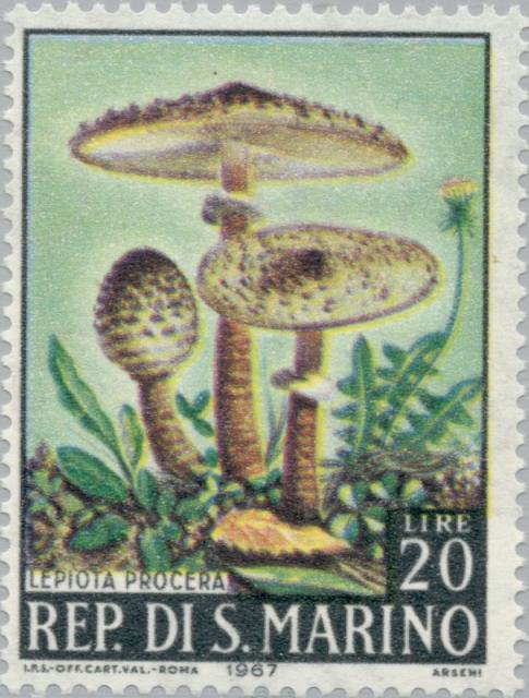 Visibility: public Image owner: none postage 6/15/1967 30l multi dt=mushrooms (1967 San Marino) d=Lepiota procera (1967) wmk=triskelion perf=14 Crops No visible images cropped from this one. Measurements Resolution is unknown. Source Source name: Colnect File URL: http://i.colnect.net/b/171/555/Lepiota-procera.jpg Uploaded August 26, 2014, 4:51 pm by Stan Shebs |