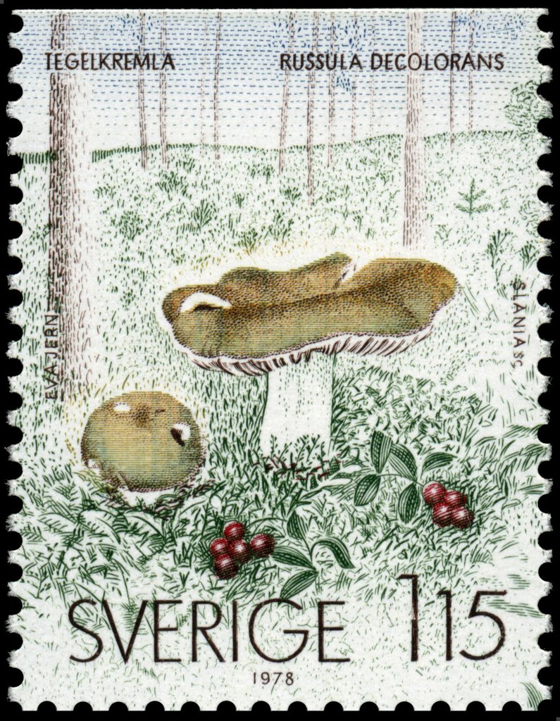 Visibility: public Image owner: none postage 10/7/1978 1.15kr multi issue=Mushrooms 1978 dt=mushrooms (1978 Sweden) d=Russula decolorans unwmk Crops No visible images cropped from this one. Measurements Resolution is unknown. Source Source name: Colnect File URL: http://i.colnect.net/b/4363/135/Russula-decolorans.jpg Uploaded January 7, 2018, 5:18 pm by Stan Shebs |