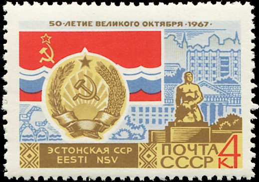 Visibility: public Image owner: none postage 8/4/1967 4k multi issue=October Revolution 50th d=flag of Estonian SSR & arms of Estonian SSR unwmk perf=12 Crops No visible images cropped from this one. Measurements Resolution is unknown. Source Source name: Colnect File URL: http://i.colnect.net/b/4494/964/Estonian-Arms-and-Flag.jpg Uploaded January 12, 2018, 7:37 pm by Stan Shebs |