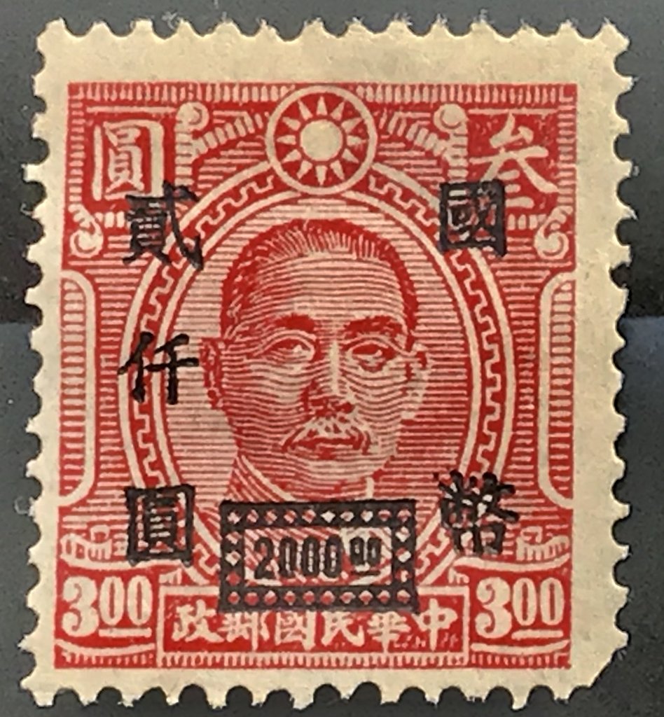 Visibility: public Image owner: none postage $2000 red issue=1947b d=Sun Yatsen (1944) oc=blk on=1944-$3-red unwmk Crops No visible images cropped from this one. Measurements Resolution is unknown. Source Source name: Colnect File URL: http://i.colnect.net/b/4616/705/Sun-Yat-Sen-overprint.jpg Uploaded January 16, 2018, 4:10 pm by Stan Shebs |