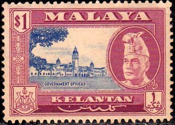 Visibility: public Image owner: none postage $1 plum&ultra issue=Sultan Ibrahim pictorials d=government offices & Sultan Ibrahim of Kelantan wmk=mult crown & script CA Crops No visible images cropped from this one. Measurements Resolution is unknown. Source Source name: Colnect File URL: http://i.colnect.net/b/4181/957/Government-offices.jpg Uploaded January 17, 2018, 11:39 pm by Stan Shebs |