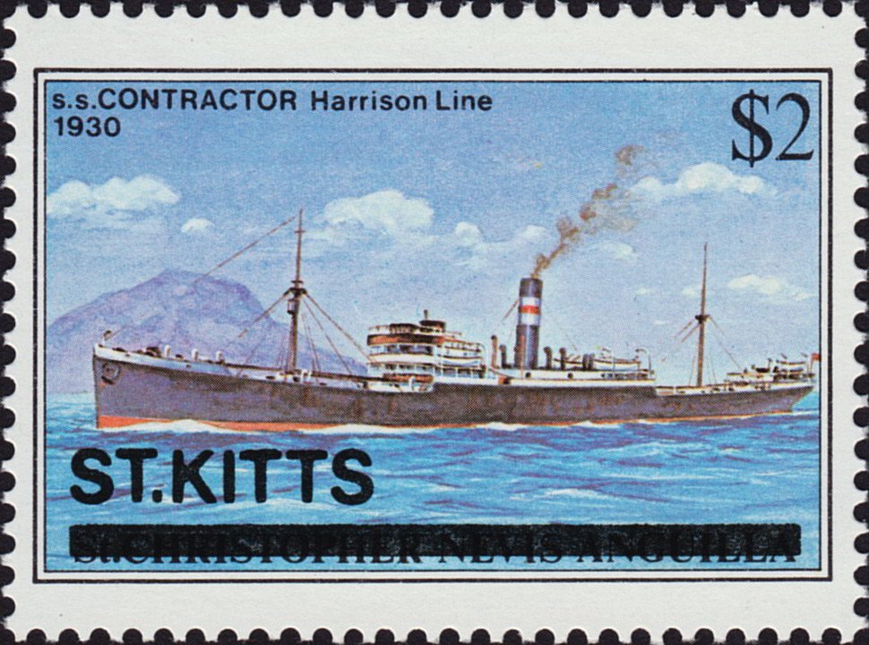 Visibility: public Image owner: none postage 8/8/1980 $2 multi issue=Ships ovpt on unissued dt=ships (1980 St. Kitts) d=SS Contractor wmk=crown & CA spiral perf=13.5 Crops No visible images cropped from this one. Measurements Resolution is unknown. Source Source name: Colnect File URL: http://i.colnect.net/b/4491/942/Harrison-Line--Contractor--1930---overprinted.jpg Uploaded January 24, 2018, 2:52 pm by Stan Shebs |
