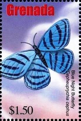 Visibility: public Image owner: none postage 10/21/2002 $1.50 multi issue=Butterflies 2002 dt=butterflies (2002 Grenada) d=blue night butterfly Cepheuprychia cephus wmk=St Edwards crown & CA perf=14.25 Crops No visible images cropped from this one. Measurements Resolution is unknown. Source Source name: Colnect File URL: http://i.colnect.net/b/4592/795/Blue-night.jpg Uploaded March 1, 2018, 6:38 pm by Stan Shebs |